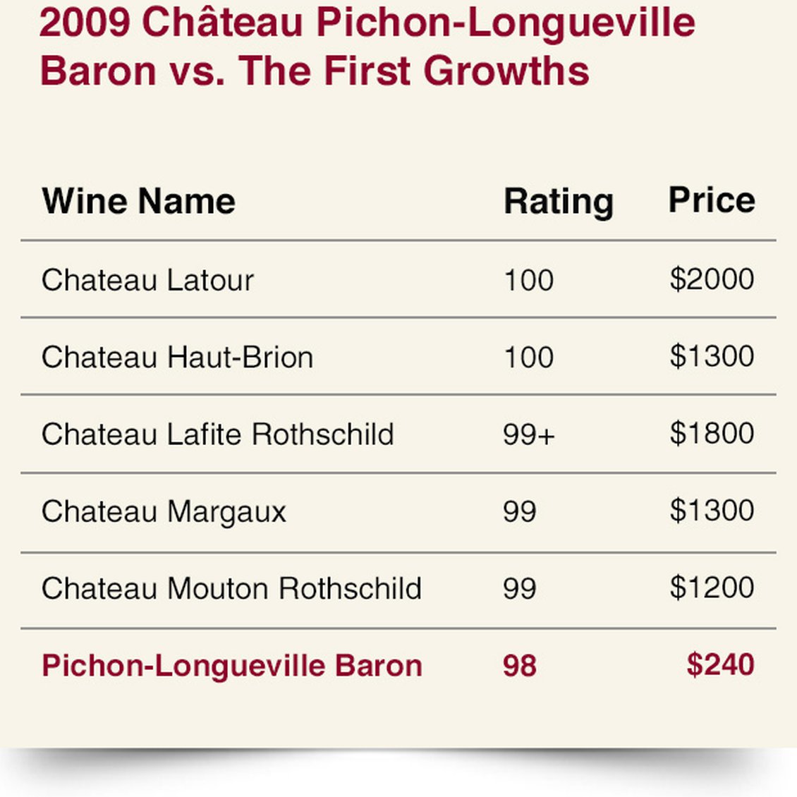 Robert Parker would soon write that “2009 may turn out to be the finest vintage I have tasted in 32 years of covering Bordeaux.” In the heart of the Left Bank, Pauillac shined like rarely before, as Château Latour ($2,000/bottle) earned 100 points from The Wine Advocate. Lafite Rothschild ($1,800) came in at 99+ points, Mouton-Rothschild ($1,200) at 99 points.